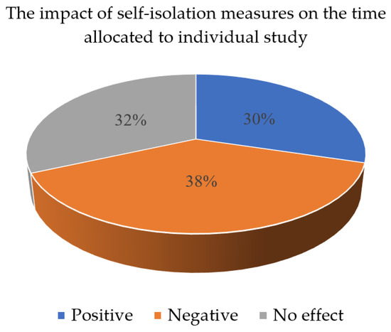Analysing the students’ answers regarding the impact of self-isolation measures on the time allocated to individual study, there is a certain equality between the percentages for the three given situations (Figure 4). The majority of the respondents reported spending more time on individual study than usual, which can be attributed to the higher number of assignments received and the need for individual study due to the lack of additional support from teachers.