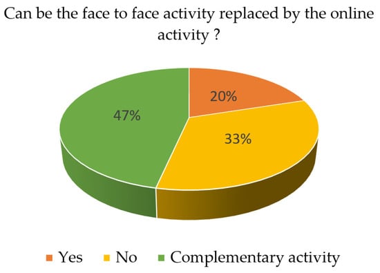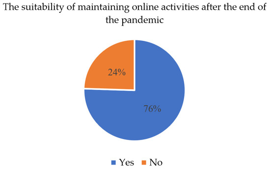 Analysing the students’ reactions regarding the possibility that face-to-face activity might be replaced by online activity, it can be mentioned that 47% of the respondents expressed that online activity should be complementary to face-to-face activity (Figure 5). This opportunity is also confirmed by the responses offered by the students concerning the suitability of maintaining online activities after the end of the pandemic, where 76% of respondents consider this action beneficial (Figure 6). There is also a slight hesitation for online studying, probably due to reluctance to change.