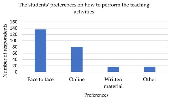 The students’ preferences on how to perform the teaching activities were found to be as follows: 54.62% of the respondents prefer face to face activity (Figure 7), while 32.13% prefer online activity. In the category of other modalities, all 17 respondents (6.83%) suggested online courses and face-to-face application activities.