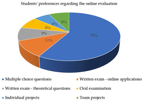 According to the analysis of the data shown in Figure 8, the majority of students (58%) prefer multiple choice questions as a form of assessment, while 64.32% consider it appropriate to focus on one or a few forms of assessment, rather than combining as many forms of assessment as possible (35.68%).