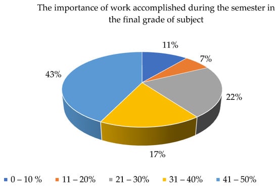 When students were asked about the importance of the work accomplished during the semester in the final grade of a specific subject, 43% of respondents declared that the percentage should be between 41% and 50% (Figure 9), followed by 21–30% (22% of respondents) and 31–40% (17% of respondents).