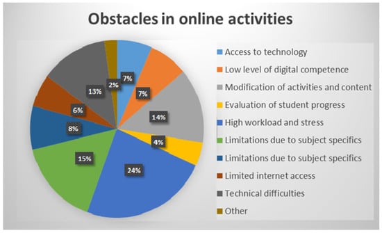 The main obstacles students faced in online activities were according to Figure 12: access to technology (24%), limitations due to subject specifics (15%), modification of activities and content (14%), and technical difficulties (13%). In the category of other obstacles, 2% of respondents identified insufficient online education skills and a lack of necessary teacher competence as well as the outdated attitudes of both students and teachers.