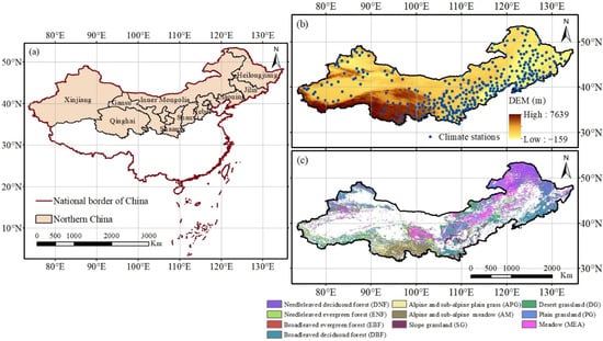 The location (a), DEM (b) and vegetation type (c) in northern China.