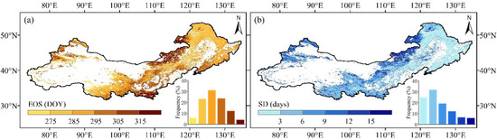 Figure 2 shows spatial distributions of mean and standard deviation (SD) of EOS in northern China from 1982 to 2016. As shown in Figure 2a, the multi-year average of EOS mainly ranged between 275 and 305 DOY (i.e., early October to the end of October) with a mean of 291.77 DOY (i.e., mid-October), which accounted for more than 66% of the pixels. Earlier EOS (<275 DOY) were mainly found in the regions of higher latitudes, e.g., southwestern Qinghai and central Xinjiang, accounting for 6.07% of the pixels. However, areas with the delayed EOS (>305 DOY) accounted for 16.19% of the pixels in southern Gansu, southern Shaanxi, and central-north Inner Mongolia. During the past 35 years, over 75% of the pixels had a lower SD of EOS (<9 days) (Figure 2b). However, 12% of the pixels located in central-north Inner Mongolia and northern Xinjiang exhibited a larger SD (>12 days).