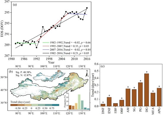 The trend of EOS in northern China from 1982 to 2016 at the regional scale (a), at the pixel scale (b), and at the vegetation type scale (c). Significance was set at p < 0.05. Note: The small map in (b) was shown pixels with significant trends in northern China (red and green indicates significant positive trends and significant negative trends, respectively). The “*” in (c) represented significant at p < 0.05 level.