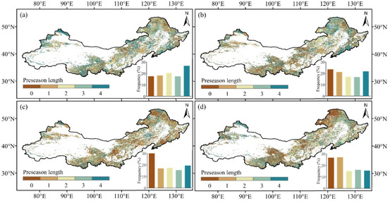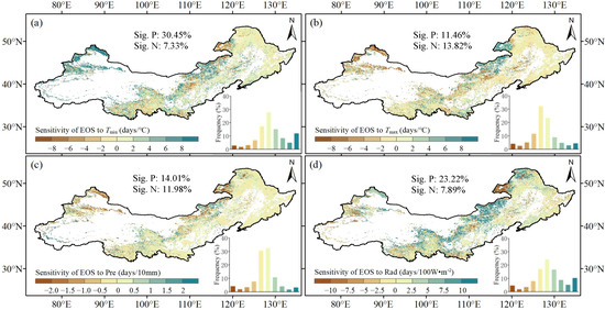 Figure 4 demonstrates the preseason length of different climatic factors. As shown in Figure 4a–d, the preseason length for these climatic factors mainly varied between 0 and 3 months, which was in agreement with previous studies [43,44]. Therefore, the sensitivity of EOS to preseason climatic factors was calculated at the pixel scale (Figure 5). As shown in Figure 5a, EOS exhibited a positive sensitivity with Tmin, accounting for 68.23% of all pixels. Pixels with a sensitivity larger than 4 days/°C accounted for 25.22%, mainly distributed in central Inner Mongolia, northern Xinjiang, and central Northwest China. This finding indicated that the increase in preseason Tmin generally caused a delayed EOS. However, the EOS for nearly 55% of the pixels had a negative sensitivity with preseason Tmax (Figure 5b), which meant Tmin and Tmax had an asymmetric effect on EOS. In addition to temperature, the sensitivity of EOS to preseason Pre and Rad showed high spatial heterogeneity (Figure 5c,d). Over 52% of the pixels had a positive sensitivity between EOS and preseason Pre. The sensitivity greater than 1 day/10 mm was mainly located in central-north Inner Mongolia, central Northwest China, and southern Xinjiang (Figure 5c), which indicated that if preseason precipitation increased by 10 mm, corresponding EOS could likely increase by more than one day in these regions. The EOS for 64.84% of the pixels had a positive sensitivity with preseason Rad, and pixels with a sensitivity larger than 5 days/100 W·m−2 accounted for 24.16% (Figure 5d), primarily located in central Inner Mongolia, northern Northeast China, central Northwest China, and northern Xinjiang.