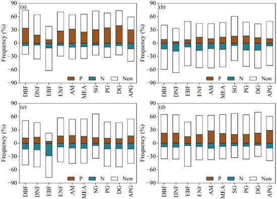 Sensitivity of EOS to four climatic factors at the vegetation type scale. (a) Tmin, (b) Tmax, (c) Pre, and (d) Rad. Significance was set at p < 0.05. Note: Bars above (below) zero line represent percentage of positive (negative) correlations. Colored parts indicate significant correlations at p < 0.05, while white parts indicate non-significant (NS) correlations.