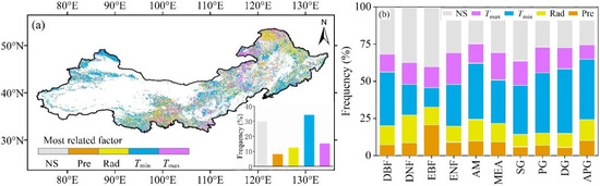 Among four climatic factors, preseason Tmin was the dominant factor for nearly 34.39% of all pixels, followed by preseason Tmax (15.23%) and Rad (12.31%). Interestingly, Tmin and Tmax had an asymmetric effect on EOS. The increase in Rad contributed to a delayed EOS; however, the impacts of precipitation were highly dependent on regions and vegetation types.