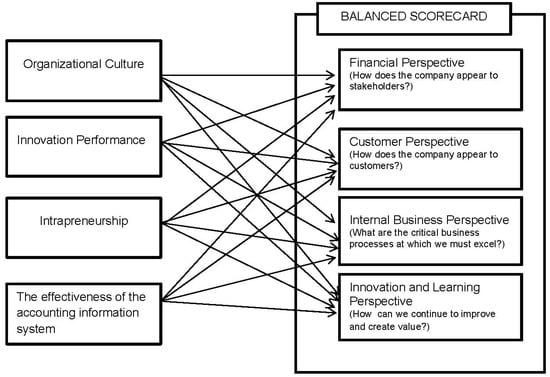 Innovative companies encourage experimentation, reward both success and failure, celebrate mistakes, enjoy taking risks, and actively assist their employees’ training and growth while providing high job security, with the result that their employees are not afraid of being fired for making mistakes [53] (p. 604). Innovative organizations allow their employees freedom and encourage risk-taking and making mistakes [54]. According to previous research [55,56], there is a positive relationship between innovation performance and a balanced scorecard. On this basis, we developed the following sub-hypotheses: