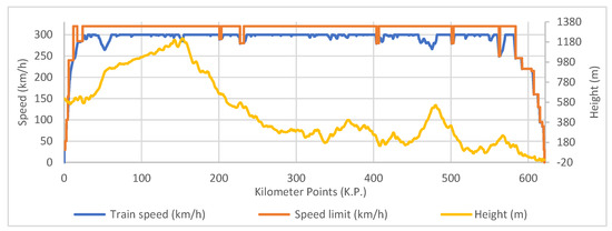 The simulation model is described in this section. This model is detailed in [45], and the results provided by the simulation were compared with real data of a Spanish HSR to validate the simulator. Differences of 1.2% for the running time and differences of 0.4% when compared with the energy consumption were shown. The model was used from [45] to design eco-driving in a high-speed line, and measurements were recorded. As a result, energy savings between 20% and 34% were measured in commercial services. It was a detailed discrete event deterministic simulation model, that combines next-event and fixed-discrete time steps for advancing the simulation clock [83,84]. The simulation model takes several input data related to the rolling stock involved in the operation and related to the railway line: