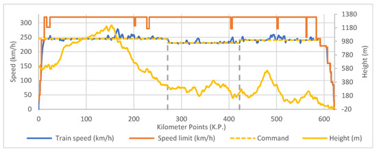 Different eco-driving strategies have been analysed in the academic literature. In some simple scenarios, driving through speed regulation has been simulated [1,12,13,14]. Other studies have proposed design by coast-remotoring cycles, having upper and lower speed limits [15,16,17] or considering coasting points along the railway line [18,19,20,21,22]. Previous strategies are appropriate for short routes on metro lines but are not very efficient for longer railway lines as the HSR lines. The speed regulation without braking has been demonstrated as an efficient and easily executed eco-driving strategy for high-speed railway lines [23,24].