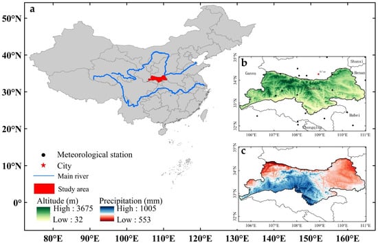 Study area (a) and distribution of meteorological stations (b) and annual precipitation 1970–2015 (c).