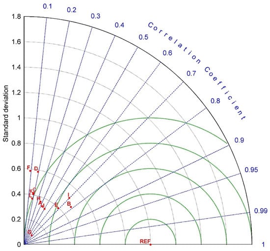 Taylor diagrams for annual precipitation over the Qinling Mountains between the CMIP6 models and observations for the period 1970–2014 (each letter represents a model, see Table 1, and REF represents the observations).