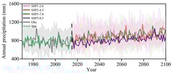 Changes in annual precipitation over the Qinling Mountains during 1970–2100, simulated using BM datasets under different SSP scenarios (the shading represents the maximum and minimum intervals).