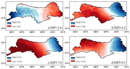 The middle and end of this century are important periods for assessing climate change in the Qinling Mountains in the 21st century. Compared with the historical period (1995–2014), the meteorological elements of the Qinling Mountains simulated using BM data show different change rates and amplitudes under different SSP scenarios in the middle of the 21st century (2041–2060) and the end of the 21st century (2081–2100). However, the spatial distributions are essentially similar (Figure 5). Areas with large increases in precipitation are concentrated in the northwest of the mountain areas, especially in the Heihe area (33°72′–34°05′ N, 107°71′–108°31′ E) at the north foot of the Qinling Mountains, whereas the smallest increase is observed in the Ziwu River area (32°95′–33°21′ N, 107°93′–108°35′ E) in the south.