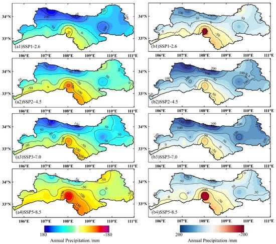 Changes in annual precipitation in the Qinling Mountains from 2041 to 2060 (a1–a4) and from 2081 to 2100 (b1–b4), relative to 1995–2014 under different scenarios.
