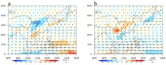 Difference between the overall water-vapor-transport flux (kg/m·s) and divergence (10−6 g/s·m2·hPa) and the average climatic state in years of abnormal precipitation along SSP1-2.6 pathway in (a) rainy years and in (b) less rainy years (red line area indicates the study area).