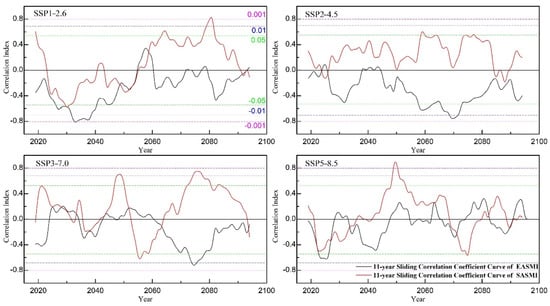 Sliding correlation curves of descending water under different emission paths and summer monsoon indices in East and South Asia in 11 years (green, blue, and purple lines represent significance at the 0.05, 0.01, and 0.001 levels, respectively).