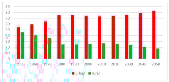The number of people living in cities accounts for 75% in Europe and 69% in Czechia []. The expected future development of urbanization is highly differentiated; Okulicz-Kozaryn [] projects an urbanization rate of more than 80% in Europe in 2050, while UN [] projects an urbanization rate of 82% in Czechia for 2050 (Figure 1). Alderton et al. [] project the fastest urbanization growth in low-to-middle-income countries.