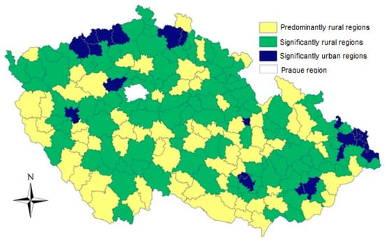 Perlin [] applied the OECD [] methodology and used a density criterion of 150 inhabitants per km2 and divided (Figure 2) Czechia into rural and urban regions. It is clear that the rural regions dominate in absolute numbers. Figure 2 highlights the need for increased attention to rural regions and the QOL in them. The OECD [] categorization has been adopted by Eurostat [].
