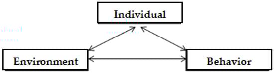 Albert Bandura [] firstly introduced social cognitive theory in 1995. Social cognitive theory is based on the premise that three variables are influencing each other (environment, behavior, and individual), as illustrated in the triangular graph (triadic reciprocal) in Figure 1:
