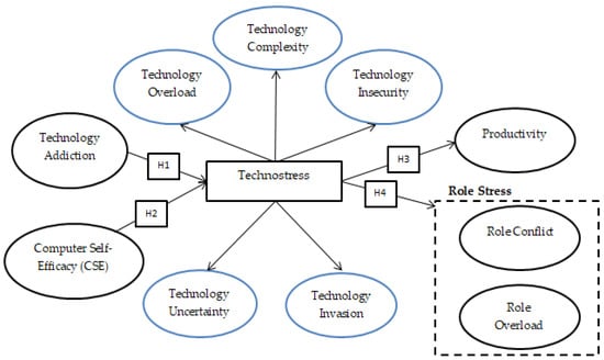 - Tarafdar, M.; Tu, Q.; Ragu-Nathan, B.S.; Ragu-Nathan, T.S. The Impact of Technostress on Role Stress and Productivity. J. Manag. Inf. Syst. 2007, 24, 301–328. [Google Scholar] [CrossRef]