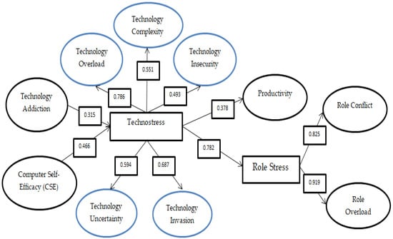All items were appropriate for the hypothesis test based on the model fit above. To test the hypothesis, an SEM-Model test was performed. If it shows a t-value > 1.96 and p-value < 0.05, it means that one variable affects another variable [,]. Based on the SME model test, each technostress instrument was accepted, meaning that respondents experienced stress during work from home due to techno-invasion, techno-overload, techno-complexity, techno-insecurity, and techno-uncertainty. Moreover, this study also showed that techno-addiction positively influenced technostress (hypothesis 1 is accepted), and technostress positively influenced role stress (hypothesis 4 is accepted). The results indicated that the higher the technostress, the more serious the role stress experienced by workers.