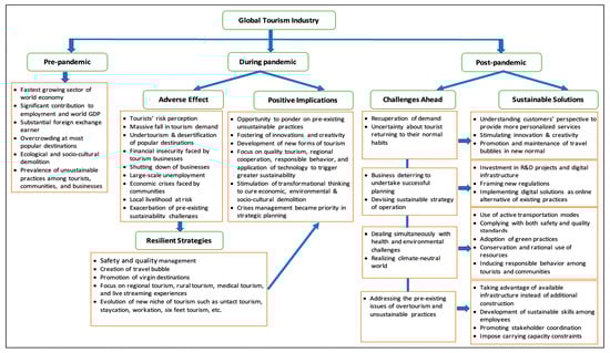 The tourism industry’s stakeholders can encapsulate the environment and social protection by forming alliance strategies to recover and survive in the post-pandemic world in a more resilient and sustainable manner [69]. Moreover, a blend of scientific discovery, digital infrastructure, new regulations, and city planning can lead the cities to effectively deal with both health crises and climate change [70].