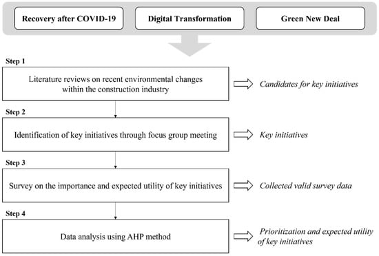 Based on a literature review, this study identified key initiatives for the recovery after COVID-19, digital transformation, and the Green New Deal, which have recently become global issues that have greatly impacted the construction industry. In addition, a survey was conducted to investigate the opinions of construction industry experts regarding the key initiatives that should be prioritized given the global changes affecting the construction industry. These initiatives were then ranked using the AHP method, and the expected short- and long-term utility of the key initiatives was analyzed and the initiatives re-ranked.