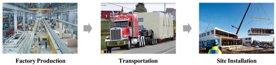 For the digital transformation of the construction industry, previous research has suggested that policies and systems related to digital construction technology should be improved, and measures to expand high-tech industry and convergence construction should be prepared [,,,,]. In this regard, the nurturing of a new technical and skilled workforce, preparation of national standards and specifications for digital construction technology, the promotion of the application of the off-site construction (OSC) method—a construction method that completes buildings and facilities by producing elements and components of a construction project at different locations where they will be permanently installed and then transporting and installing them on-site (Figure 2), the introduction of policies for the dissemination of digital construction technology for small- and medium-sized companies, and the establishment of a foundation for data utilization have all been proposed as specific measures.