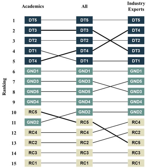 When comparing the rankings for the academics and industry experts, both groups selected DT5 as the highest priority and the top five key initiatives were related to digital transformation. However, there were some differences between the two sectors for some initiatives (Table 5). For example, DT3 was the second most important initiative for academics and only the fourth for industry experts. In addition, DT4 was the fifth and second most important initiative for academics and industry experts, respectively. In addition, there was a different opinion about technological development for the modification of production and work methods (RC5). The academics ranked its importance 10th, compared with 13th for the industry experts.