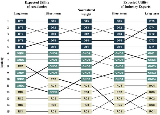 Compared with digital transformation, there was a more significant change in the rankings for the Green New Deal and COVID-19 recovery initiatives when the expected utility was considered. In particular, significant changes were observed in the expansion of the green remodeling industry (GND5), the introduction of new and renewable energy (GND2), and technological development for the modification of production and work methods (RC5). The overall importance of GND5 was ranked eighth, but the academics ranked it tenth in the long term, and the industry experts ranked it sixth in the short term and seventh in the long term. The overall importance of GND2 was ranked tenth, but in the short term, the academics ranked it twelfth. Finally, RC5 had the most prominent change in ranking. It was ranked eleventh in overall importance, whereas the academics ranked it eighth in the long term and the industry experts ranked it twelfth in the long term and fourteenth in the short term. This indicates that RC5 is more important to the academic sector than to industry experts in relation to recovery after COVID-19.