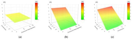 3D-surface plots demonstrating the results of statistical model. (a) Pedestrian Density = 0.50. (b) Clumpiness = 1.00. (c) Directional Heterogeneity = 0.25.