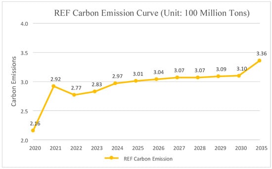 Table 5. REF Carbon Emissions. - Carbon Emission CurveIn the REF, the carbon emission curve of G province’s power system is shown in Figure 2 below. The carbon emissions will gradually increase before 2030, but they will not peak. In 2030, the carbon emissions will stand at 310 million tons, of which 294 million tons are from total electricity consumption and 16 million tons are from grid losses.