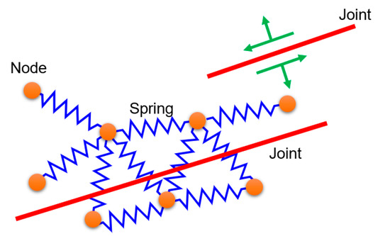 The change in normal force and tangential force of the spring can be calculated by the relative displacement of the node, that is [25]: