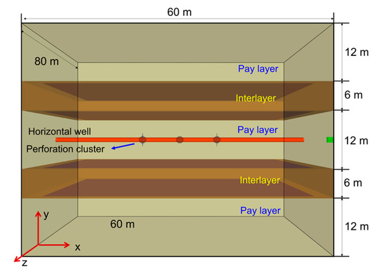 According to the geological characteristics of interlayered tight oil reservoirs in the north of the Songliao Basin, a multiple fractures’ propagation model of an interlayered tight sandstone reservoir is established by using the 3D lattice method, as shown in Figure 2. The model size is 60 m × 80 m × 48 m, including three pay layers with a thickness of 12 m and two interlayers with a thickness of 6 m. There is a lithologic interface between the pay layer and the interlayer. A horizontal well with three perforation clusters is set in the middle pay layer, and the initial cluster spacing is 10 m. In the model, the minimum horizontal principal stress (σh = 35 MPa), the vertical stress (σv = 38 MPa) and the maximum horizontal principal stress (σH = 40 MPa) are applied in the x, y and z directions, respectively. The rock mechanical parameters and fracturing treatment parameters in the model are shown in Table 1. The rock mechanical parameters are obtained from the laboratory mechanical tests, and the treatment parameters are based on the field data.