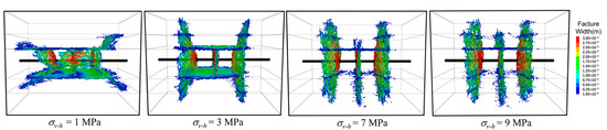 The vertical stress difference (σv−h) in this paper is defined as the difference between the vertical in-situ stress and the horizontal minimum principal stress. As shown by comparing the fracture propagation modes in Figure 3, σv−h has a significant impact on multi-fracture propagation. When σv−h = 1 MPa, the three hydraulic fractures have different longitudinal propagation behaviors after encountering the upper and lower lithologic interface. Due to the small vertical stress difference, the induced stress near the wellbore is reversed, and the intermediate hydraulic fractures have significant torsional propagation before encountering the interface. At the initial stage, the outer hydraulic fractures deflect and propagate along the interface, then penetrate into the interlayer again and extend towards the direction of the horizontal minimum principal stress in the interlayer. Until the fracturing procedure is completed, the three clusters of hydraulic fractures cannot penetrate into the adjacent pay layers. When σv−h = 3 MPa, the outer two clusters of hydraulic fractures penetrate the interlayers in the longitudinal direction, so as to better communicate the upper and lower pay layers. However, when the intermediate fracture encounters the interface, an “H” shaped extension mode appears, and its extension path is completely limited to the intermediate pay layer. When σv−h increases to 7 MPa, the upper end of the middle hydraulic fracture still extends along the lithologic interface, but the lower end of the fracture penetrates the interlayer and communicates with the adjacent pay layer. When σv−h increases to 9 MPa, the longitudinal propagation capacity of the intermediate hydraulic fracture is improved, but it still cannot penetrate the upper interlayer.