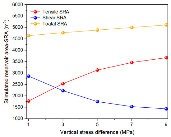 Figure 4 shows the statistical results of the stimulated reservoir area (SRA) under different σv−h. The tensile SRA reflects the tensile fracture in the rock matrix, which includes the extended fracture in the pay layer and fractures that penetrate into the interlayer, whereas the shear SRA represents the shear fracture that deflects and extends along the lithologic interface. When there is no dip angle in the interlayer, the total SRA of the three clusters of hydraulic fractures gradually increases with the increase in σv−h, in which SRA significantly increases and shear SRA gradually decreases, indicating that the increase in σv−h will limit the ability of hydraulic fractures to extend along the interface, so as to increase the ability of hydraulic fractures to penetrate the interlayer and communicate with adjacent pay layers. Figure 5 shows the variation of tensile SRA with σv−h under different interlayer inclinations. In the interlayered tight sandstone formation with different dip angles, the promotion effect of σv−h on the vertical propagation ability of hydraulic fractures is different. When the dip angle of the interlayer increases to 20°, although the tensile SRA still increases with the increase in the σv−h, the increased amplitude decreases with the increase in the dip angle of the interlayer, indicating that the dip angle of the interlayer has a significant inhibitory effect on the vertical expansion of hydraulic fractures. To improve the vertical propagation ability of multiple clusters of fractures and the communication effect of longitudinal pay layers, it is critical to select a reservoir with a large vertical stress difference and a small interlayer dip angle.