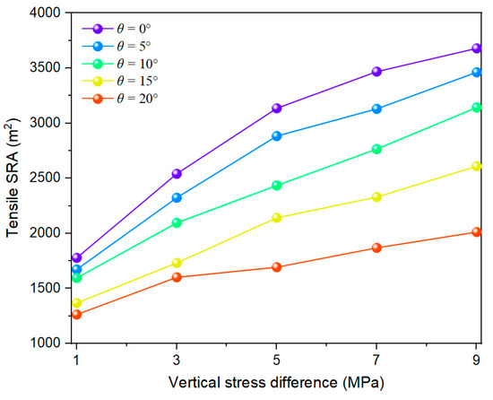Variation of total SRA with vertical stress difference under different formation dip angles.