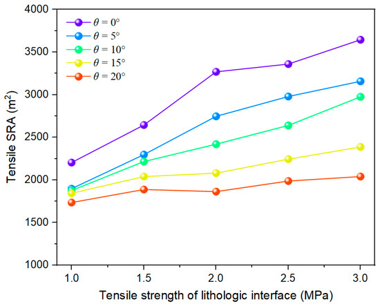 Variation of total SRA with lithologic interface tensile strength under different formation dip angles.