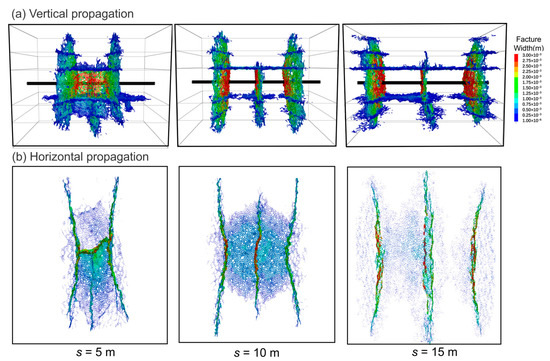 Cluster spacing (S) has an important influence on whether an efficient fracture network can be formed [28,29]. At present, the cluster spacing in the multi-clustered fracturing design scheme of the tight sandstone reservoir in the north of the Songliao basin ranges from 5 m to 15 m. However, the reasonable cluster spacing to ensure the longitudinal capacity and transverse extension range of multiple fractures still needs to be further explored. In Figure 12, the numerical simulation results show that when S = 5 m, the interaction between multiple fractures is the most significant, which is characterized by the continuous torsion of the intermediate hydraulic fracture when it propagates in the middle pay layer. In the longitudinal direction, the middle fracture deflects along the upper and lower lithologic interface, while in the transverse direction, only one end of the middle fracture extends to the far field, and the other end twists violently near the well and communicates with the outer two clusters of fractures. A more complex fracture shape is formed near the wellbore, but the longitudinal extension range of the fracture is small. When S increases to 10 m, the interaction among hydraulic fractures near the wellbore is significantly weakened, and there is no communication between multiple fractures in the middle pay layer, and the longitudinal propagation ability of the three clusters of fractures is improved. When S increases to 15 m, the multiple fractures hardly interfere with each other near the wellbore, and the three clusters of hydraulic fractures penetrate the sandstone interlayers in the longitudinal direction, successfully communicating with multiple nearby pay layers. In the transverse direction, with the increase in cluster spacing, the length of the middle fracture increases while the length of the two outer clusters decreases. It demonstrates that increasing cluster spacing can greatly reduce interference among hydraulic fractures. The larger the cluster spacing is, the lower the inhibition degree of the outer fracture to the propagation of the middle fracture is.