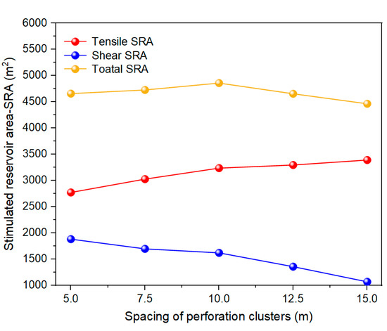 In Figure 13, with the increase in S from 5 m to 15 m, the total SRA shows a trend of first rising and then falling and has the highest value when S = 10 m. The tensile SRA gradually increases, and the shear SRA gradually decreases, which indicates that the increase in cluster spacing will improve the longitudinal propagation ability of multiple hydraulic fractures and weaken the deflecting extension ability of fractures at the interfaces. Figure 14 shows the variation of hydraulic fracture length of each cluster with cluster spacing. Both the intermediate hydraulic fracture length and the total length of three fractures increase significantly as cluster spacing increases, indicating that increasing cluster spacing weakens the horizontal competitive propagation effect of multiple hydraulics. When the cluster spacing exceeds 15 m, although the induced stress among multiple fractures is lowered further and each fracture tends to propagate separately, the matrix seepage region between hydraulic fractures is too wide. Based on the above analysis, a cluster spacing of 15 m may ensure that multiple fractures penetrate the interlayer in the longitudinal direction, allowing multiple pay layers to connect, and that multiple clusters of fractures fully propagate in the transverse direction.
