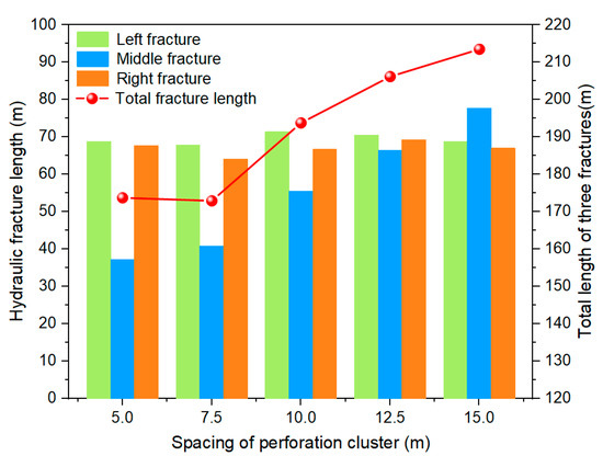 Variation of each cluster of hydraulic fractures’ length with cluster spacing.