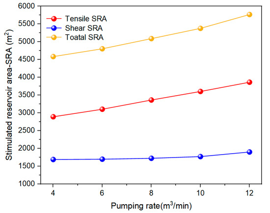 In Figure 16, the total SRA and tensile SR dramatically A rise when Q increases from 4 m3/min to 12 m3/min, but shear SRA changes little, indicating that increasing Q improves the longitudinal extension capacity of multiple clusters of hydraulic fractures. Existing studies indicate that increasing the Q in homogeneous reservoirs increases the fluid pressure in the fracture, which increases the height and width of the hydraulic fracture and reduces the length to some extent, indicating that the fracturing operation with higher Q is conducive to the formation of short and wide fractures [34,35]. However, the results of this study are different from the above conclusions. In the interlayered tight sandstone reservoir, the total length of the three clusters of fractures increases first and then decreases with Q (Figure 17). The reasons behind this law can be summarized in two aspects. On the one hand, when Q is small, the filtration of fracturing fluid in the lithologic interface is large, which reduces the net pressure in the fractures, thus weakening the horizontal and vertical extension ability of hydraulic fractures. On the other hand, when Q is small, multiple clusters of hydraulic fractures near the wellbore will communicate the torsional fractures generated by other hydraulic fractures. The torsional fractures near the wellbore will also weaken the vertical and horizontal extension ability of hydraulic fractures. Therefore, when Q increases from 4 m3/min to 8 m3/min, the total length of the three clusters of fractures shows an increasing trend. When Q is increased from 8 m3/min to 12 m3/min, however, the propagation of hydraulic fractures along the lithologic interface and torsional propagation near the wellbore cease to be significant. At this time, the overall length of the three fracture clusters decreases as Q increases. Although the multiple clusters of hydraulic fractures’ total length are slightly reduced under the injection rate of 12 m3/min compared with the pumping rate of 8 m3/min, they are ideal for communicating with the adjacent pay layers to improve the SRV and improve the production efficiency of multi-layered reservoirs.