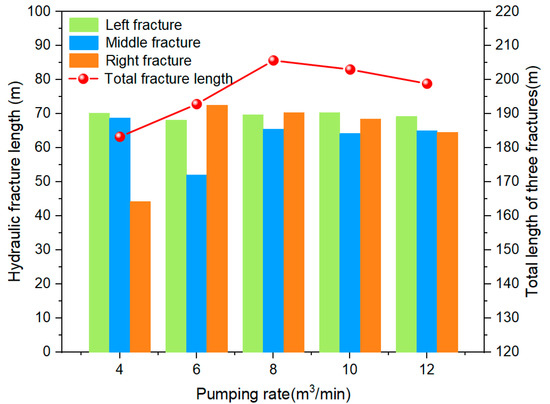 Variation of each cluster of hydraulic fractures’ length with fracturing fluid pumping rate.