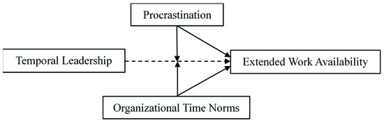 We also introduce employee procrastination and organizational time norms in our conceptual model (see Figure 1). Procrastination refers to the individual tendency to delay an intended course of action [31]. Having a lack of self-control, procrastinators usually cannot complete tasks within regular business hours. Then, they might need to deal with work matters even in nonworking hours (i.e., EWA) to catch up with deadlines, especially without certain action-facilitating stimuli such as time pressure and positive affect [32]. In addition, procrastination could also play a role in shaping the effects of temporal leadership on employee EWA. Because temporal leadership might elicit employees’ positive affect (e.g., vigor [33]) if it is moderately strong, this helps employees overcome procrastination and complete one’s job within working hours [32]. Otherwise, an extremely strong temporal leadership might hamper employees’ positive affect (e.g., job satisfaction [34]) because of the deprivation of autonomy in deciding how to use time themselves. Additionally, this inhibits employees from initiating tasks earlier, such that they need to handle unfinished work matters during off-time (i.e., EWA). Compared with procrastination, organizational time norms delineates the intangible and shared patterns of expected temporal activity at the organization level [19,35]. Previous research has shown that certain patterns regarding the usage of time (e.g., polychronicity [36]) would increase procrastinating behavior. We contend that organizational time norms might influence employee EWA because procrastinators usually must deal with work even outside the working hours if they cannot complete their job at work. Furthermore, organizational time norms serves as the time-related context in which temporal leadership is exerted. It could also interact with temporal leadership when influencing employee EWA. This is because previous research has found that the effects of temporal leadership depend on whether time is limited [37] or shared temporal cognitions exists [38] to some extent.