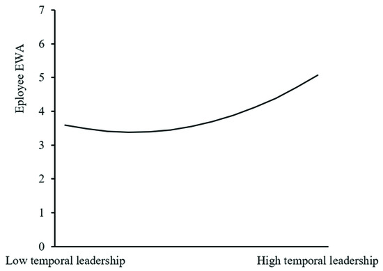 When testing the effect of organizational time norms, the positive coefficients of organizational time norms in model 5 (β = 0.35, p < 0.001) and model 6 (β = 0.27, p < 0.01) were both positive and significant, providing further support for Hypothesis 4, which states that strong organizational time norms have a positive association with employee EWA. In addition, the inclusion of the interaction term computed with temporal leadership squared and organizational time norms in model 6 explains greater variance in employee EWA over and above model 5 (ΔR2 = 0.02, p < 0.10). Furthermore, the interaction between temporal leadership squared and organizational time norms is positive and significant (β = 0.24, p < 0.05). These results provide support for Hypothesis 5, which states that the U-shaped relationship between temporal leadership and employee EWA is moderated and intensified by strong organizational time norms. Following Aiken and West [87], we probed the moderating effect by plotting the relationship between temporal leadership and employee EWA at one standard deviation above and below the mean of organizational time norms. As can be seen in Figure 3, when organizational time norms are strong, the U-shaped relationship between temporal leadership and employee EWA is attenuated.