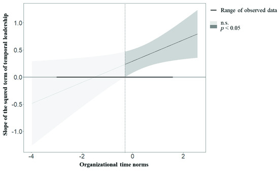 To present the interaction effect of the squared term of temporal leadership and organizational time norms on employee EWA more precisely, we further probeb the conditional effect of the squared term of temporal leadership on employee EWA using the Johnson–Neyman technique [90]. As can be seen in Figure 4, when organizational time norms are strong but with values within their range of observed data (−3.00, 1.58) in the current study, i.e., greater than −0.30, the slope of the squared term of temporal leadership in Model 6 is positive significant (p < 0.05). Even though the slope of the squared term of temporal leadership in Model 6 would be negative and significant (p < 0.05) when organizational time norms’ values are smaller than −16.00, this would not be probed in the current study because the range of observed values of organizational time norms is (−3.00, 1.58). In a sense, this result provides further support for the moderating role organizational time norms play in intensifying the positive association between temporal leadership and employee EWA when organizational time norms are strong.