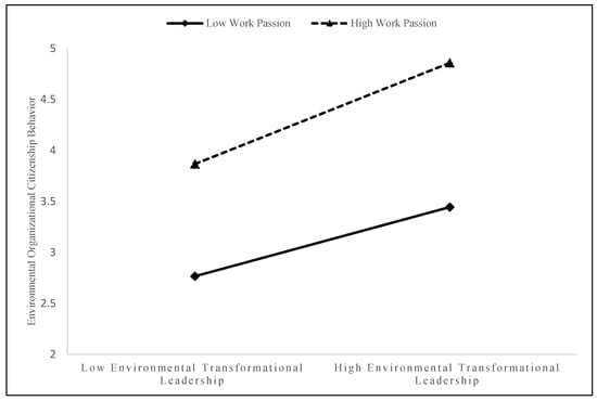 Work passion moderates the relationship between environmental transformational leadership and environmental organizational citizenship behavior, such that the relationship is stronger when work passion is high.