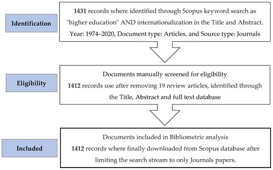 Data mining was conducted using the Scopus database between November 14 and 19, 2021. The main theme of this study is to select research articles that focused on the title and abstract that included “higher education” and internationalization. The oldest publications were dictated in 1974, while the most recent dates of publication were from 2020. The analysis was extended through 2020. This approach contrasts, for example, with Saubert and Cooper [32], who analyzed higher education internationalization research over a twenty-year period from 1991 to 2017. The search question string used was: TITLE-ABS (“higher education” AND internationalization) AND (LIMIT-TO (SRCTYPE, “j”)) AND (LIMIT -TO (DOCTYPE, “ar”)) AND (EXCLUDE (PUBYEAR, 2022) OR EXCLUDE (PUBYEAR, 2021)) AND (LIMIT-TO (LANGUAGE, “English”)). As a result, the output of this query string found as many as 1412 documents. Additional phrases were added in the query string, and there were potential review articles that were not relevant to our study. Articles that were stated as irrelevant contained terms such as review, revisit, progress, and advance in the title and abstract. After filtering all documents, through reading from abstract and full texts, it was found that 19 of them were review articles. A Scopus unique article identifier, EID, which identifies these review articles is added to the next search string so that any irrelevant articles will not be included in the next search result.
